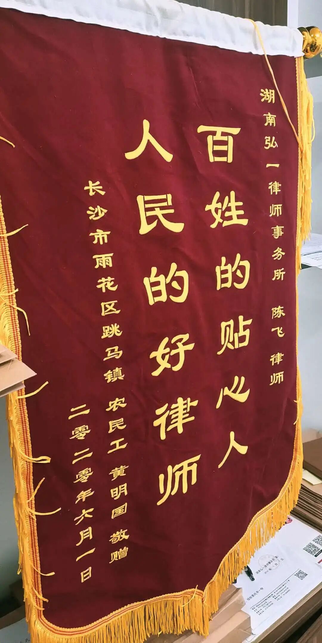 “请问陈飞律师在吗?我们今天是来给他送锦旗的,感谢他为我们争取到赔偿。”
